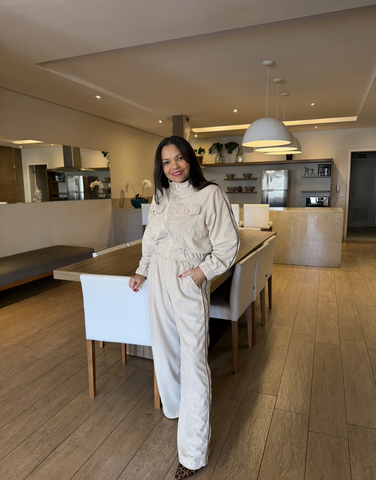 Conjunto de em veludo cotelê, jaqueta com elástico nas mangas e na cintura, fechada por zíper , bolsos frontais