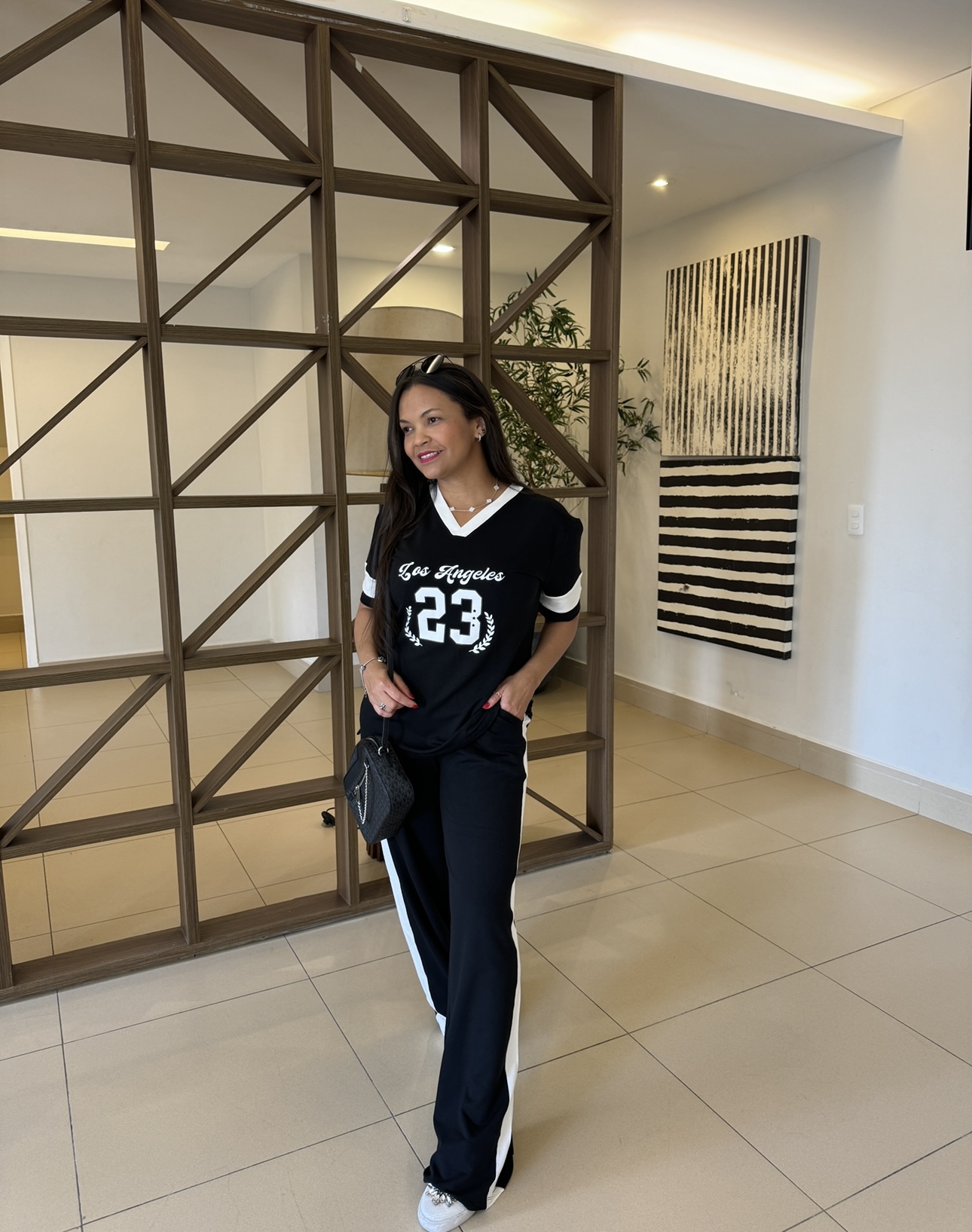 Conjunto em moletinho, calça com cos em elástico, bolsos lateral e faixas branco