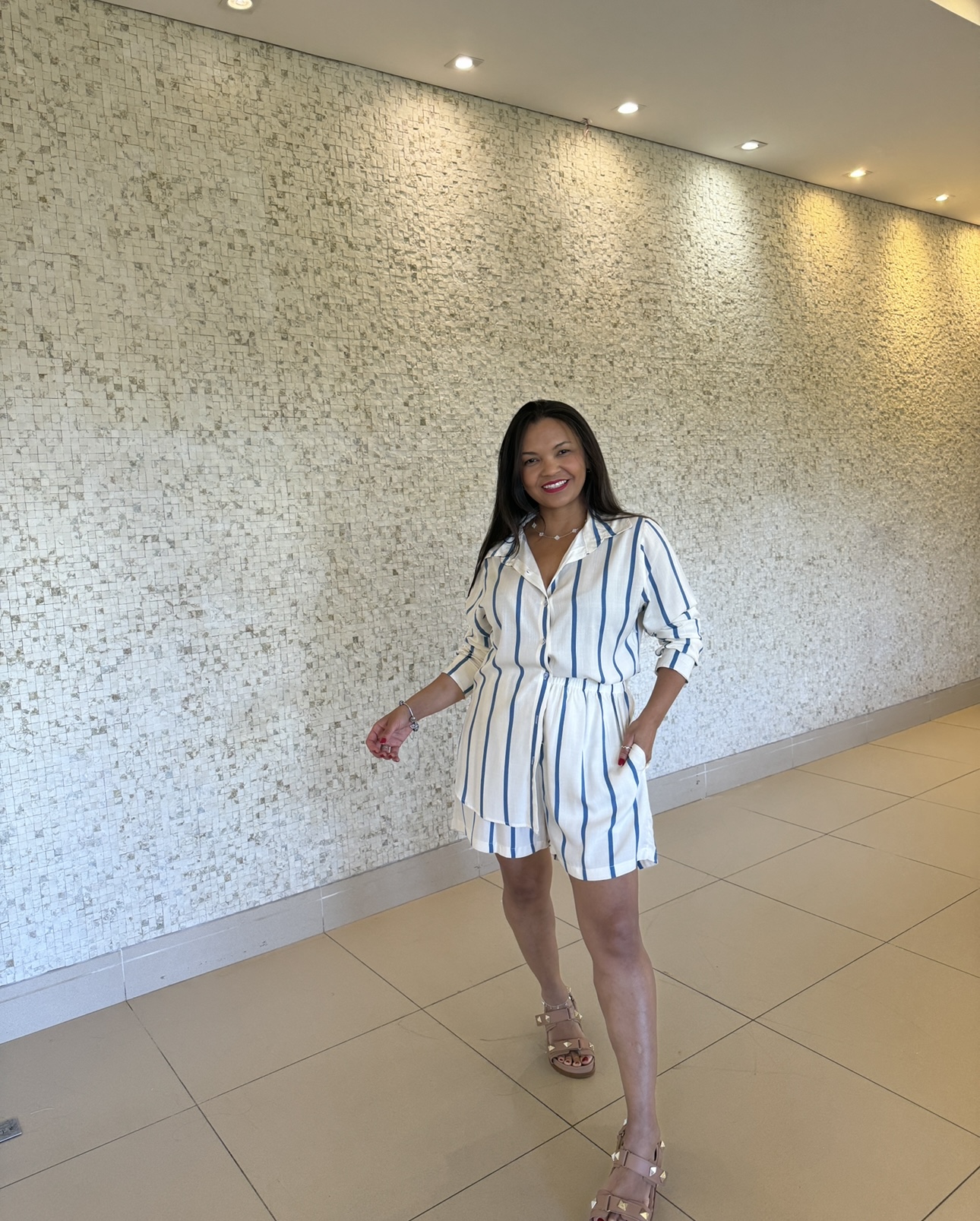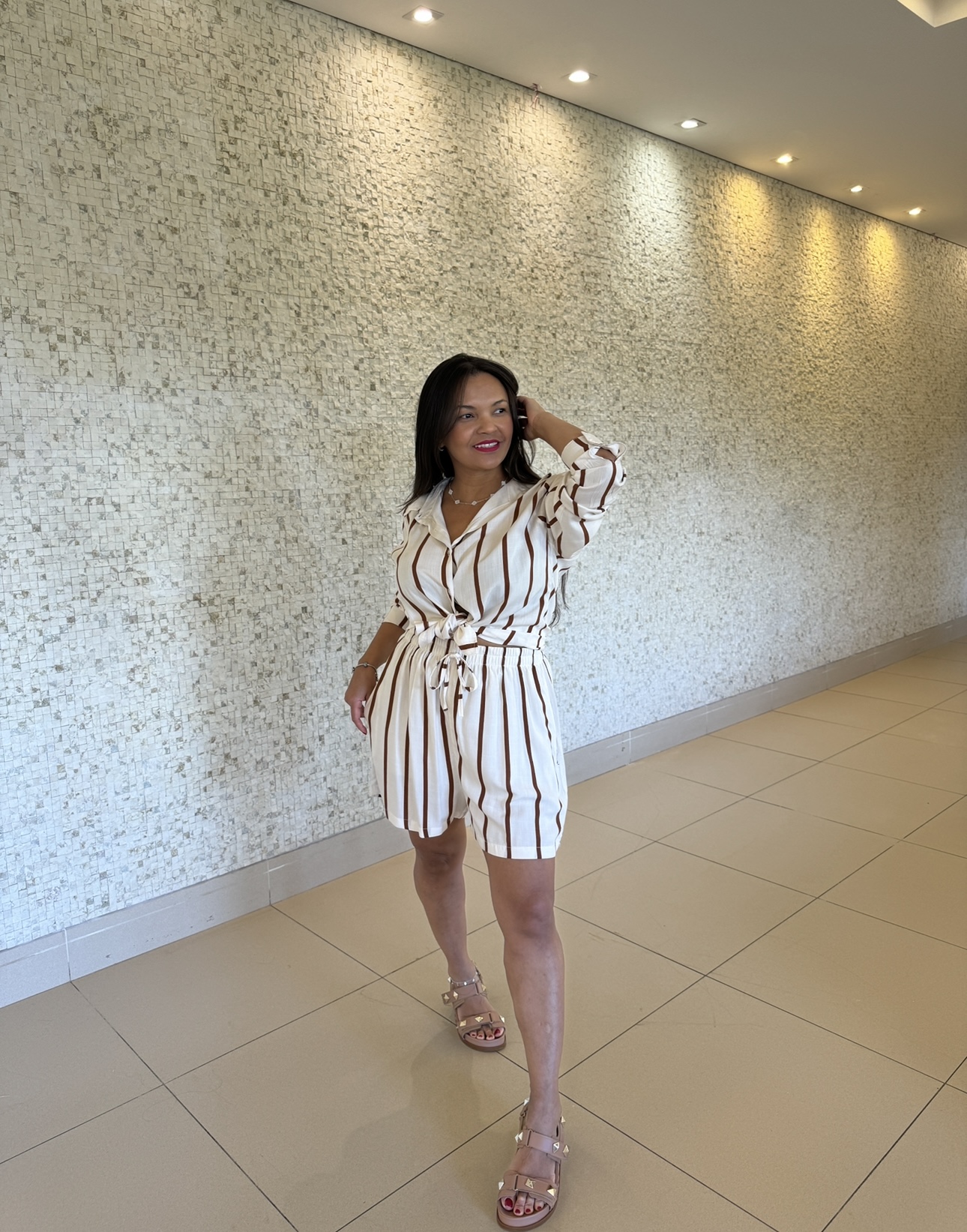 Conjunto em tecido leve,viscolinho, camisa com botão funcional
