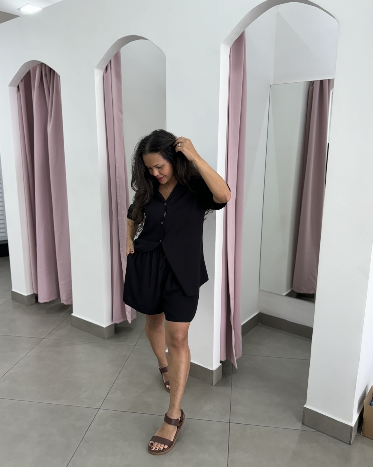 Conjunto em tecido leve,viscolinho, camisa com botão funcional