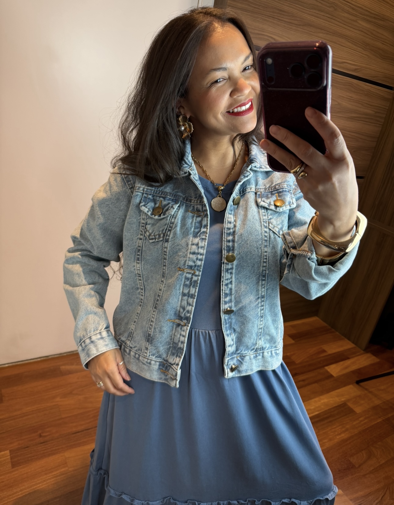 Jaqueta jeans , com bolsos e detalhes de pedras aplicado , aquela pecinha que nunca é demais ter no armário, combina com exatamente tudo .