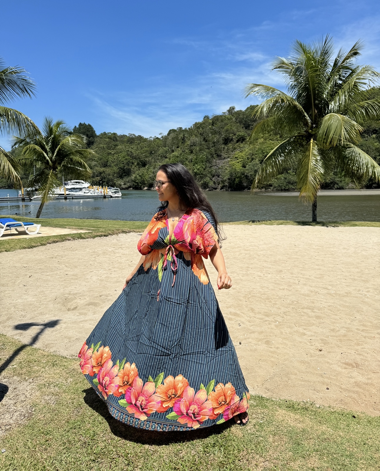 Vestido em viscose , ajuste na parte do busto e saia bem ampla, mangas largas