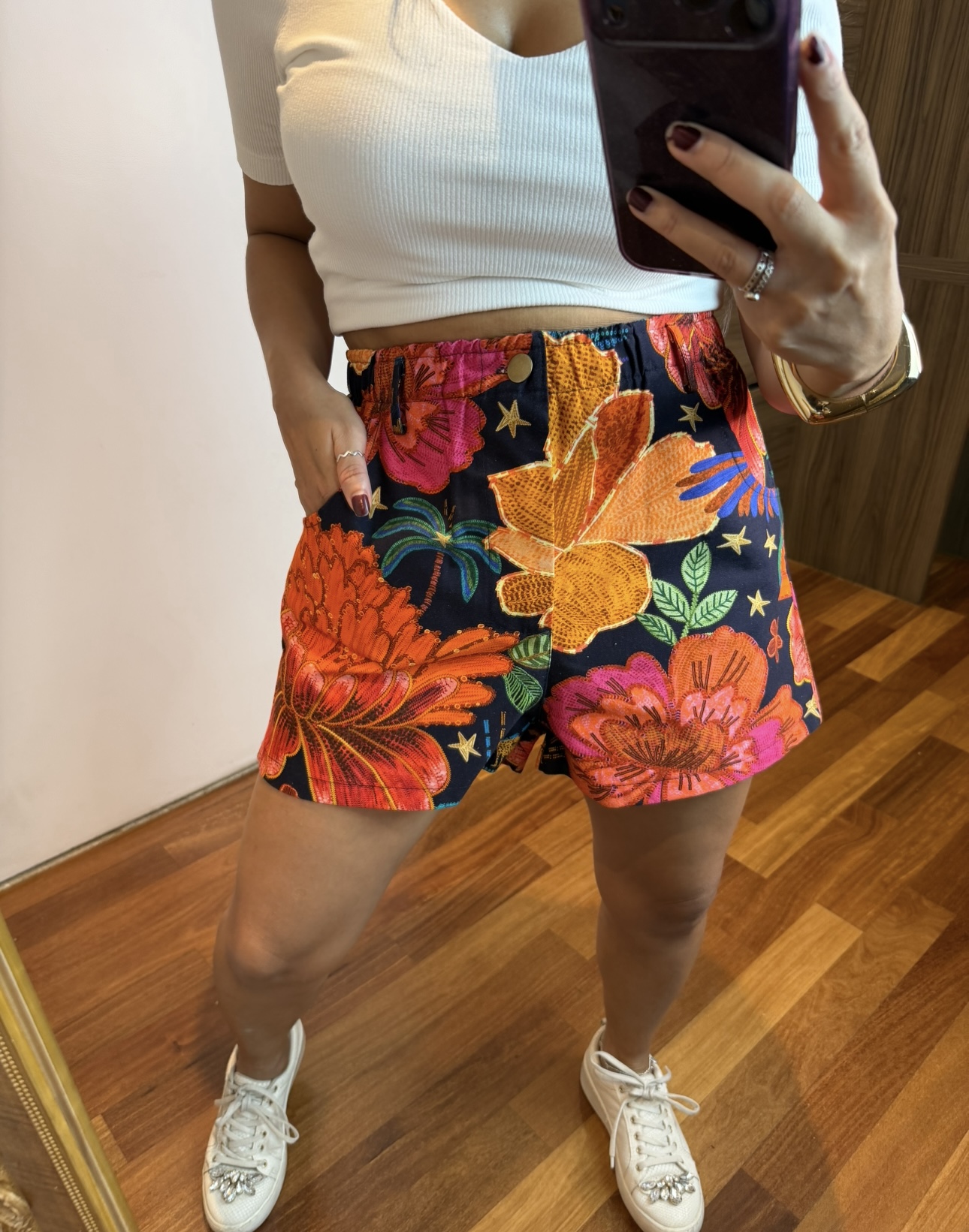Shorts em sarja , cos todo em elástico , passantes, bolsos frontais