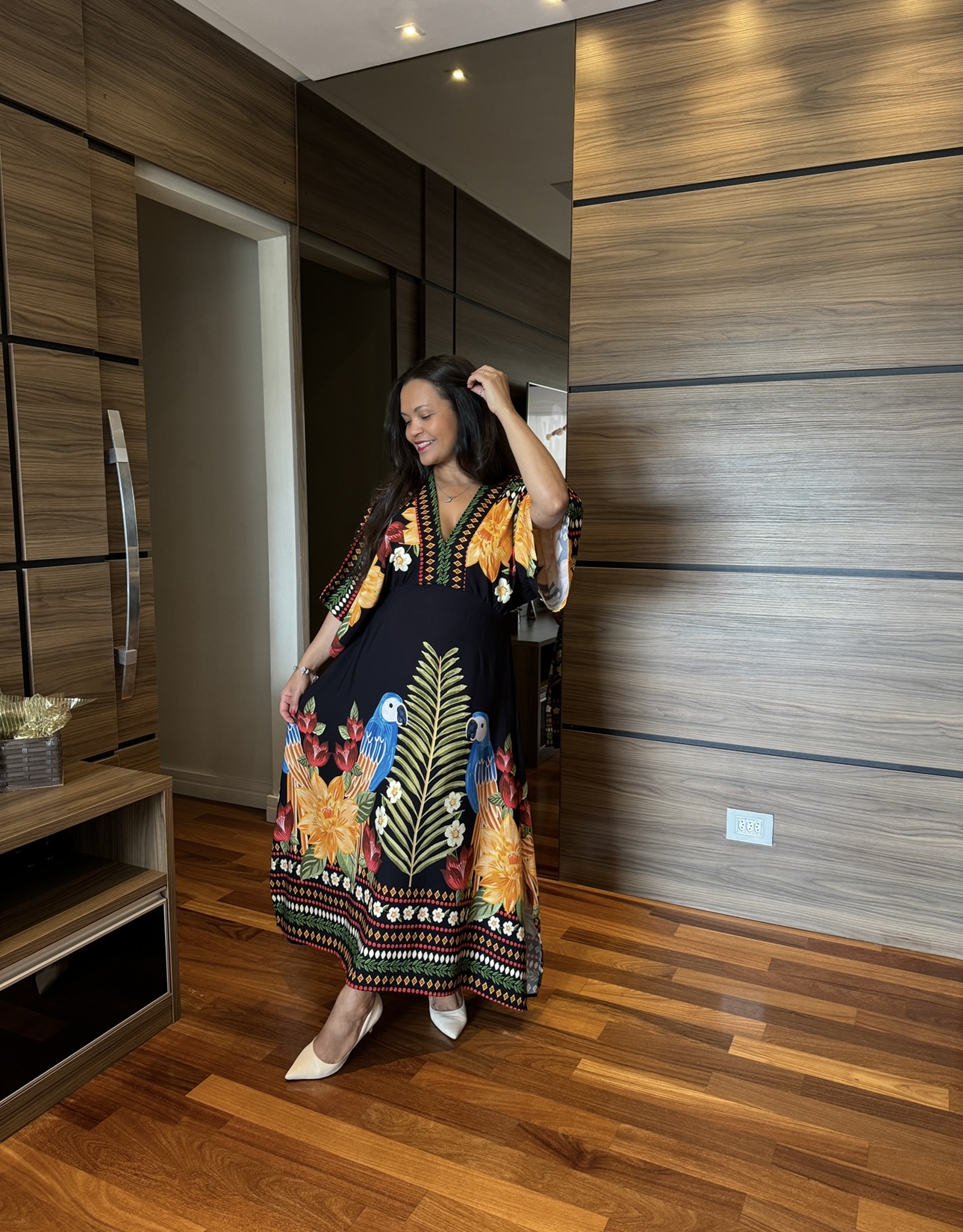 Vestido mídi em viscose , estampa exclusiva, vestindo amplamente por conta da manga estilo Kimono, quadril amplo