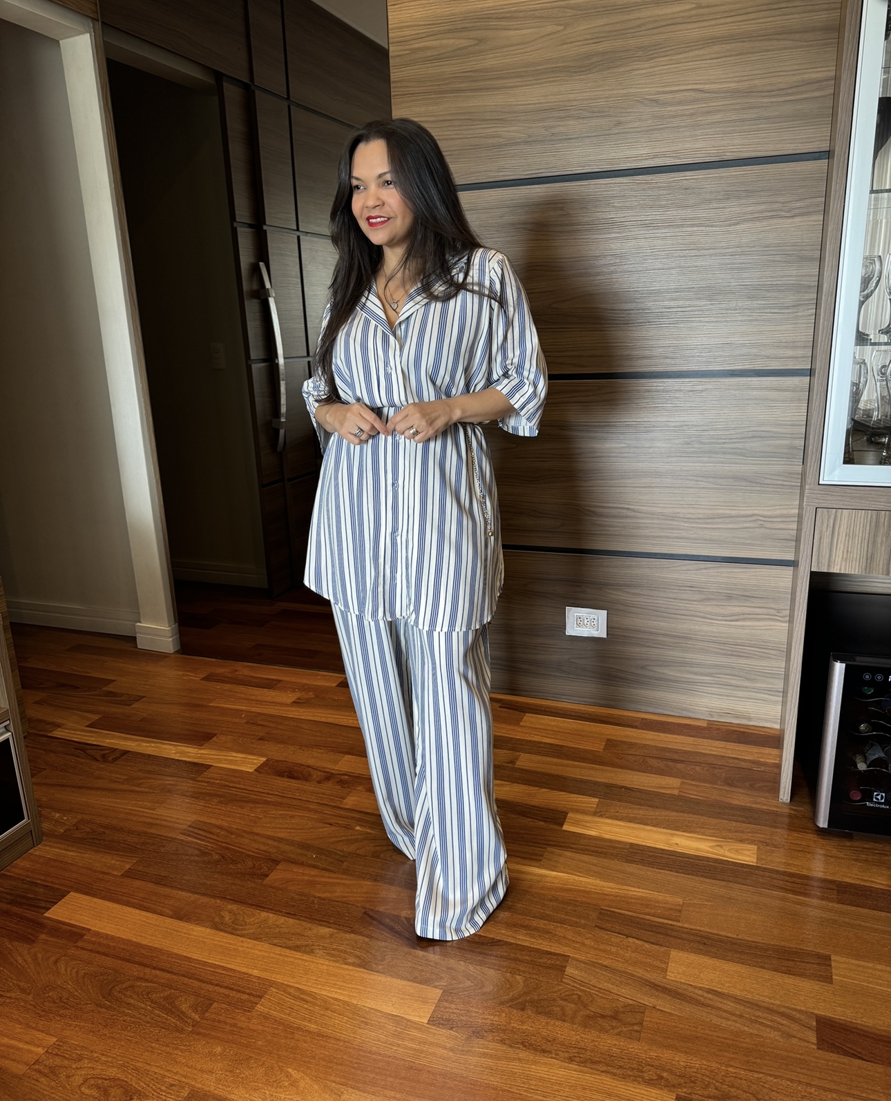 Conjunto em viscolinho , camisa com botão funcional , punho fechado por botão , e calça com cos em elástico e bolsos frontais