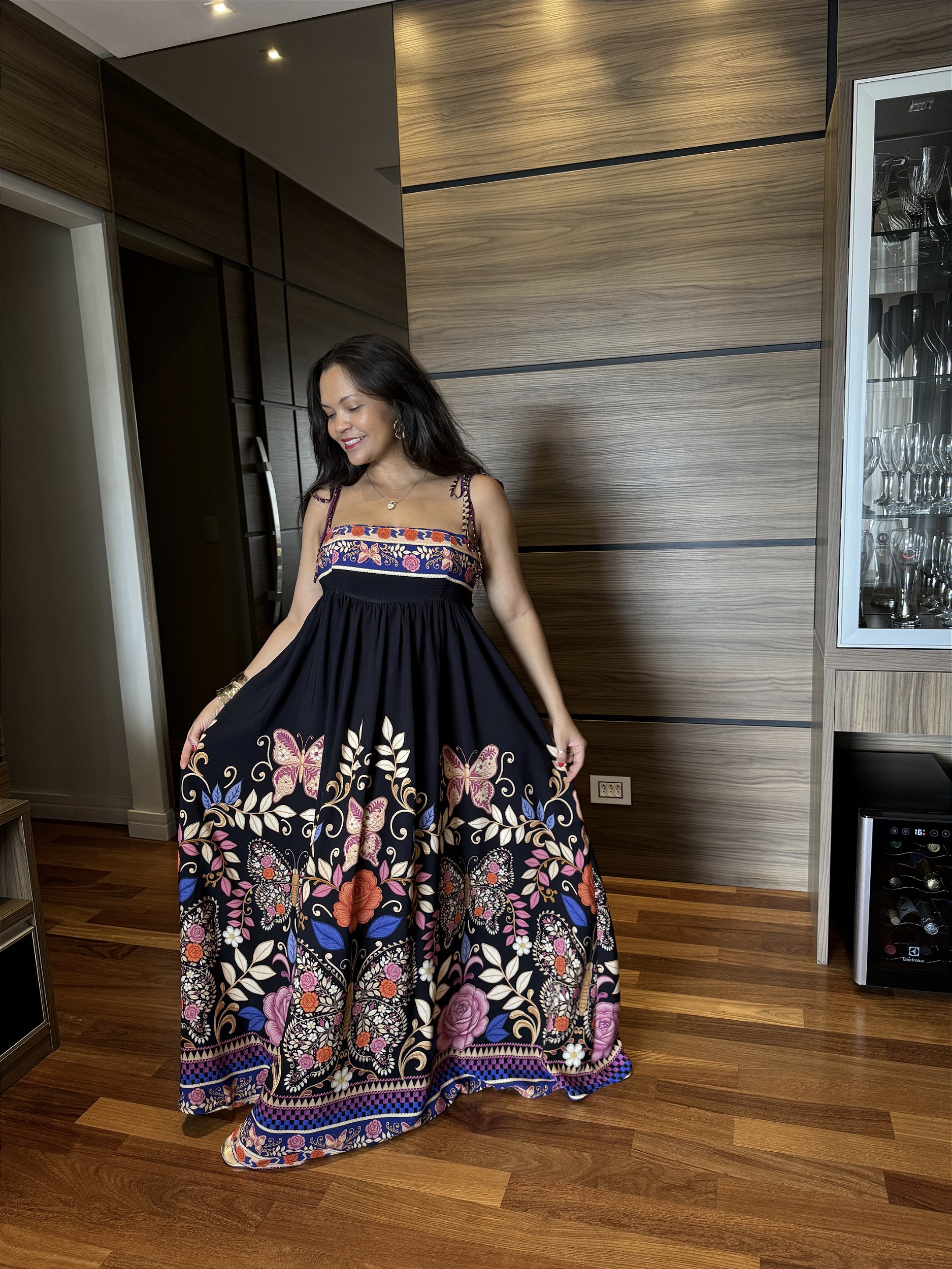 Vestido em viscose pré lavada , alça regulável com amarração, bolsos lateral , lastex na região das costas